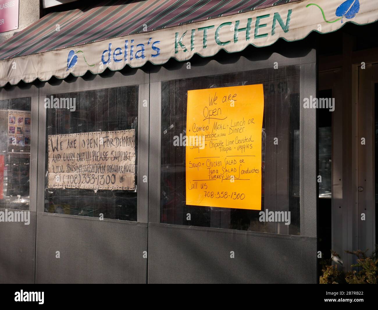 Oak Park Illinois Usa 17th March 2020 Signs On A Restaurant Window In The Downtown Area Of This Western Chicago Suburb During The Coronavirus Covid 19 Pandemic Governor Pritzker Has Ordered Restaurants Only Open
